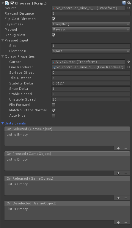To maximize platform support of Chooser, the actual inputs that drive the Pressed and Released events can be fully customized. Out of the box you can use the Pressed Input section of the Chooser inspector to set any number of keys or joystick input you may need. You can even leverage custom calls into Chooser if you are supporting multiple platforms for even greater control by simply calling Chooser's Pressed() and Released() methods. For instance, let's support the Vive with input from either trigger:
