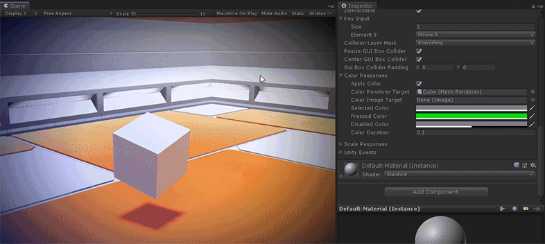 Simply add Collider Button on anything with a collider and your button is ready to roll. Collider Button offers easy inspector adjustments for responses in color, size, and if you prefer, easy event hook-ups.