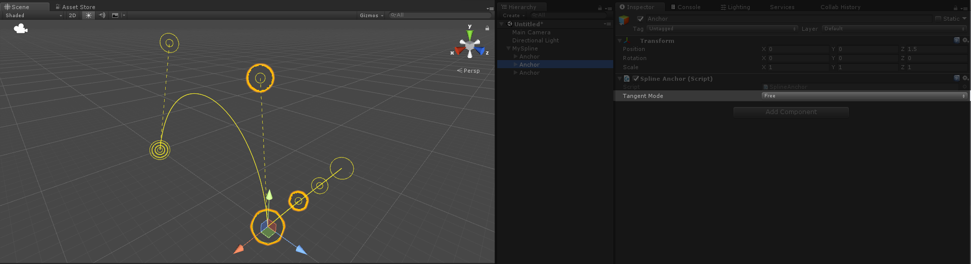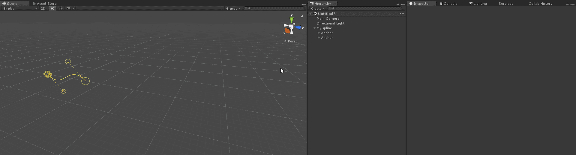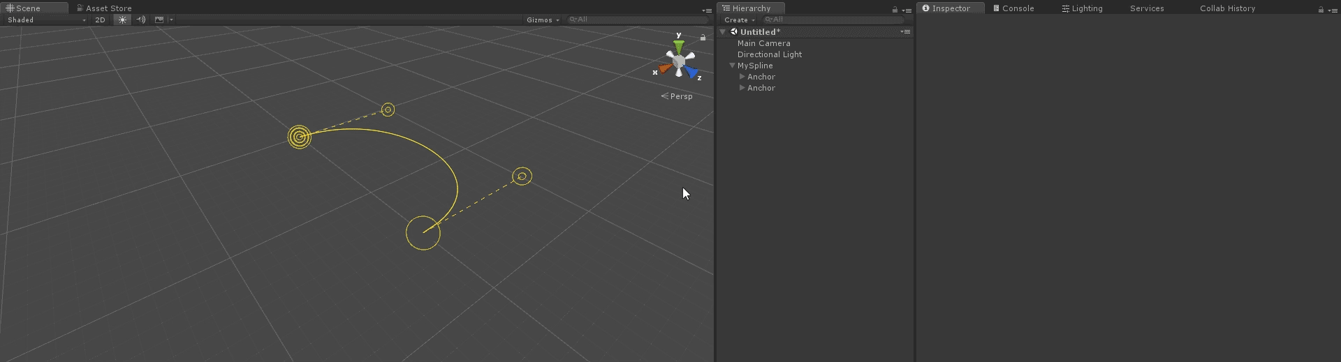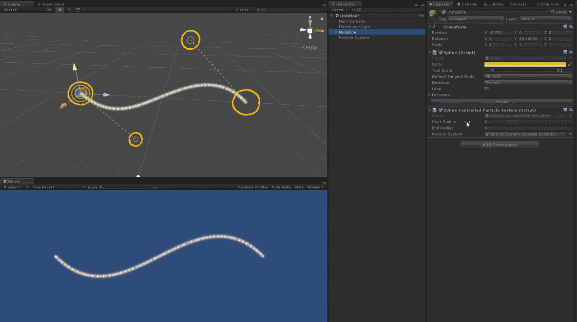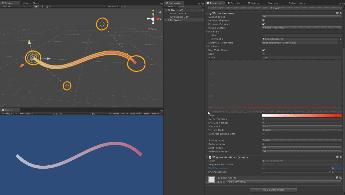 By default a spline does not render in-game. However, adding a SplineRenderer component will cause a spline to feed its data into Unity's LineRenderer to make itself visible for creating stylish weapon trails, dynamic wires and all kinds of crazy stuff.